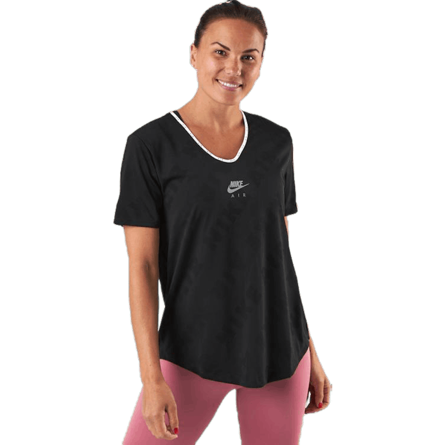 Nike - Air Top SS Black/Silver är en ventilerande löpartröja avsedd för aktiva löpare. Den har en lätt, modern silhuett som passar både träning och vardagsbruk. Det jacquardmönstrade Nike Air‑grafiken och Dri-FIT-teknologin håller dig sval och fokuserad under löpningen. Materialet transporterar bort fukt för torr komfort.