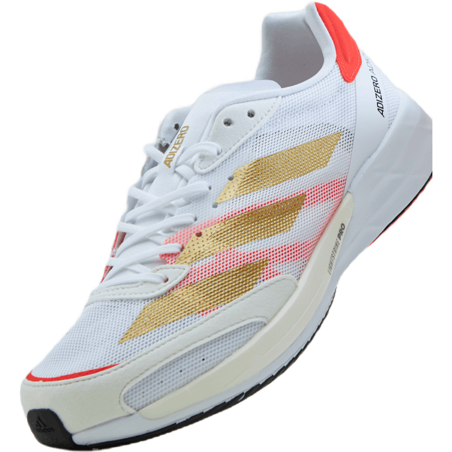 Adizero Adios 6 Tokyo-träningssko i Cloud White, Gold Metallic och Solar Red är lätta löparsko designade för snabbhet och komfort. Den lätta byggnaden kombineras med en responsiv mellansula som ger ett säkert avstamp vid varje steg. Tokyo-utgåvan har en strömlinjeformad silhuett och tydlig färgblockering som passar löpare som vill ha snabb återkoppling och kontroll i tempot.